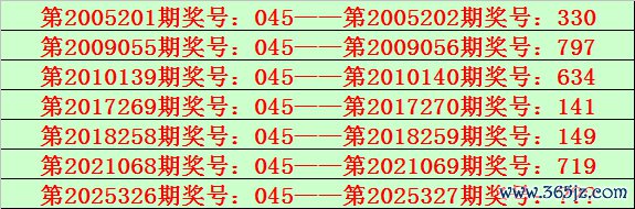 陈设三第2025326期开出奖号045,该号码直选类型历史上出现了7次,前6次开出之后期下期奖号为:330、797、634、141、149、719,见下表: