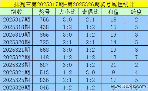 上期回来:陈列三第2025326期出现奖号045。开出组六,奇偶比1:2,012路比1:1:1,大小比1:2,和值9,跨度5。